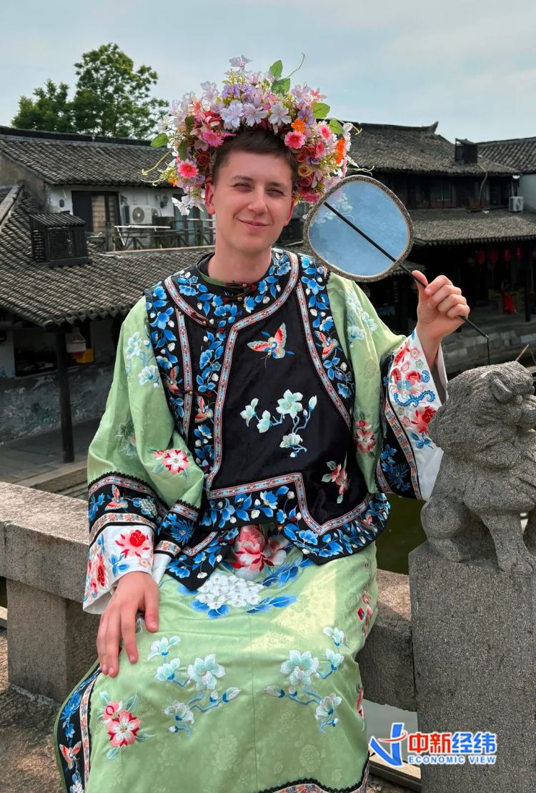 “很多人夸我漂亮。”来自法国的Titi向中新经纬晒出了他的照片——照片里,这位棕色短发的外国小伙子身着一套绿色的“格格装”,头戴花环,手举团扇,坐在浙江嘉兴西塘古镇一座石桥边,露出开心的笑脸。